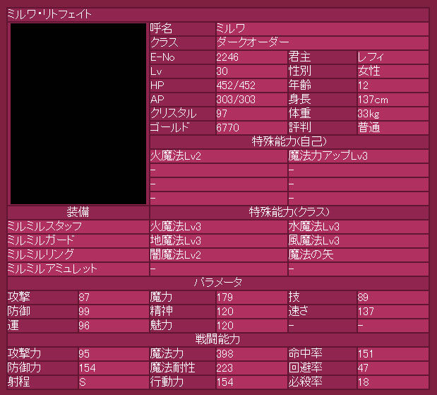 これから先、ミリィの登場する先には大抵ミルワが登場することになります。こっちとしても、名前も技名も装備名も苦労しなくてすむから楽だし。
