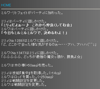 他の人はどんなキャラ作ってるのかなあとパーティー掲示板を見ると、ミリィが「ただいま次元移動中~」と書いているのを見ました。ひょっとしたら同じキャラでいくつもりかな?と思うと、ちょっとしたいたずら心が沸きました。ライバルであるミルワをいきなり登場させてびっくりさせてやろう。そんな軽い気持ちでインビジにもミルワが登場したのです。