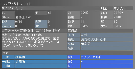 まず、手始めは自分のキャラクター「ミルワ・リトフェイト」からです。